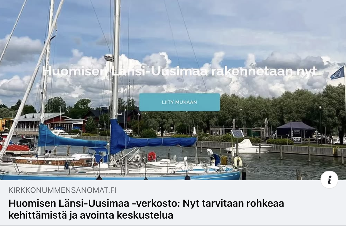 "Joukko Länsi-Uudenmaan asukkaita on päättänyt perustaa vapaamuotoisen kansalaisverkoston nimeltä Huomisen Länsi-Uusimaa. Verkoston tavoitteena on edistää rakentavaa keskustelua, vahvistaa alueen elinvoimaa ja kannustaa kehitykseen.