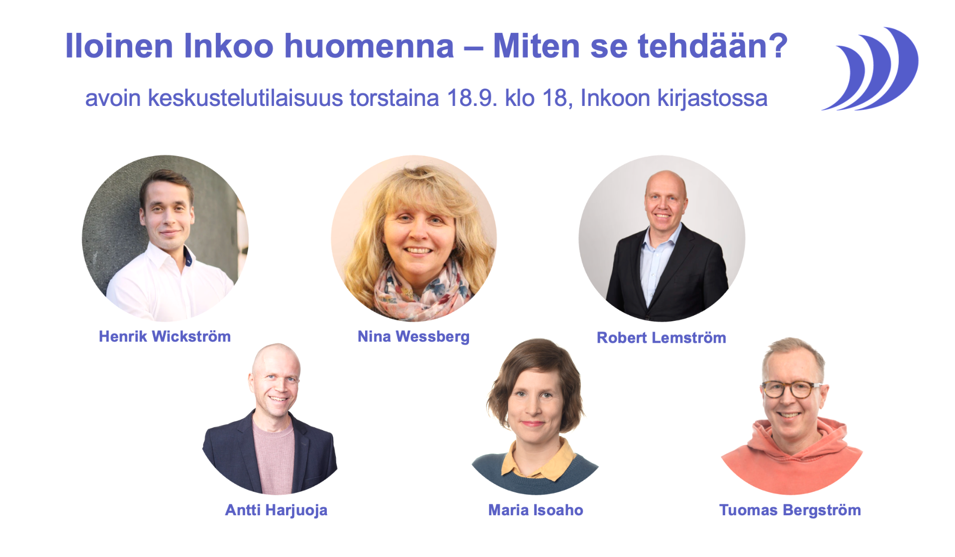 Torstaina 18.9. Inkoon kirjastossa järjestetty keskustelutilaisuus "Iloinen Inkoo huomenna – Miten se tehdään?" kokosi yhteen kuntalaisia pohtimaan Inkoon ja koko Länsi-Uudenmaan tulevaisuutta. Tilaisuuden avasi kansanedustaja ja kunnanhallituksen puheenjohtaja Henrik Wickström, ja keskusteluun osallistuivat paikallispuolueiden edustajina Robert...